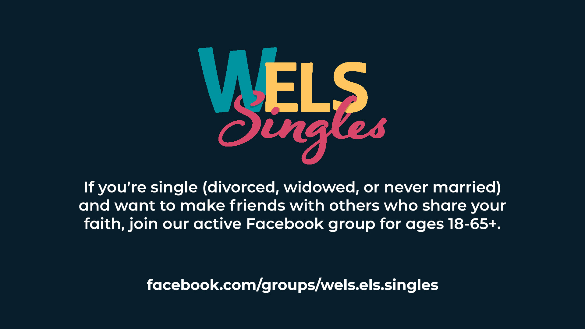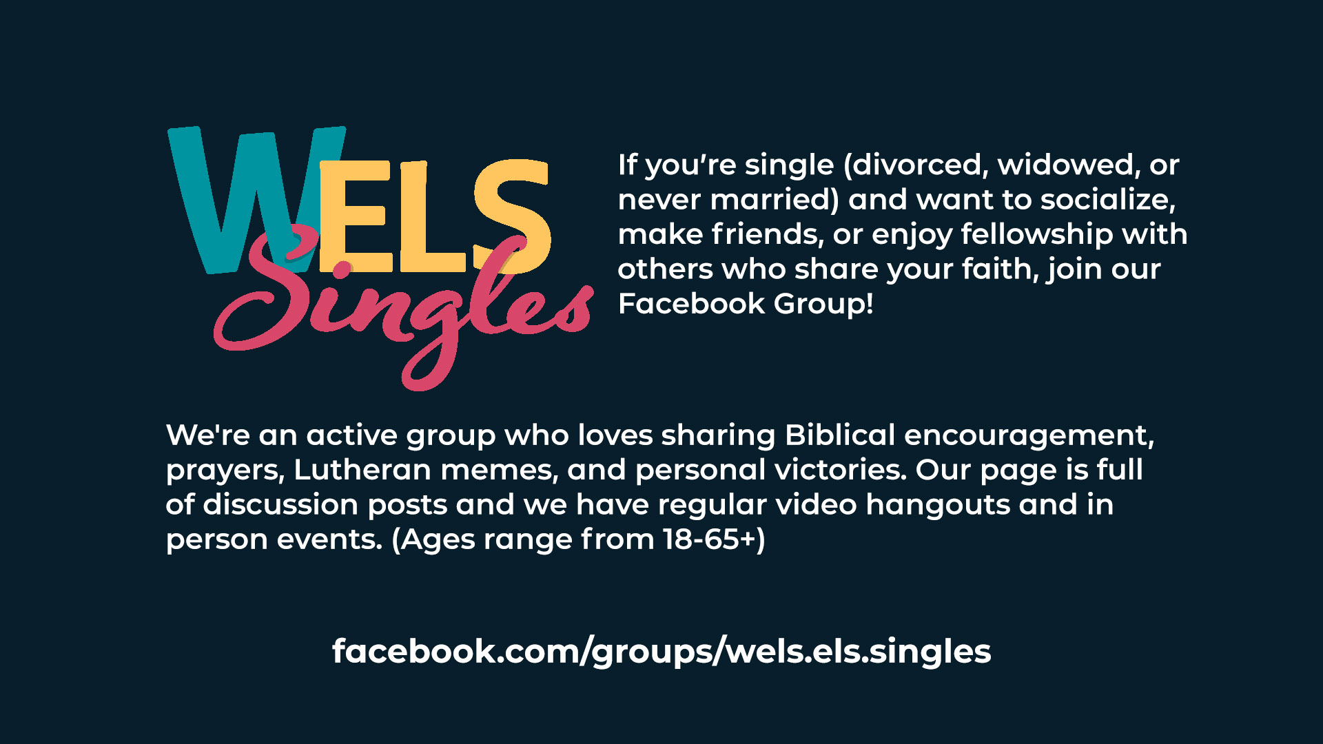 If you're single (unmarried, divorced, widowed) and looking to socialize, make friends, or enjoy fellowship with other singles who share your faith, we encourage you to join our Facebook group! Our group consists of over 1100 members with ages ranging from 18-65+. We're an active group who loves sharing Biblical encouragement, prayers, lutheran memes, personal victories, and food. Our page is full of discussion posts and we hold regular online and in person get togethers. https://www.facebook.com/groups/wels.els.singles